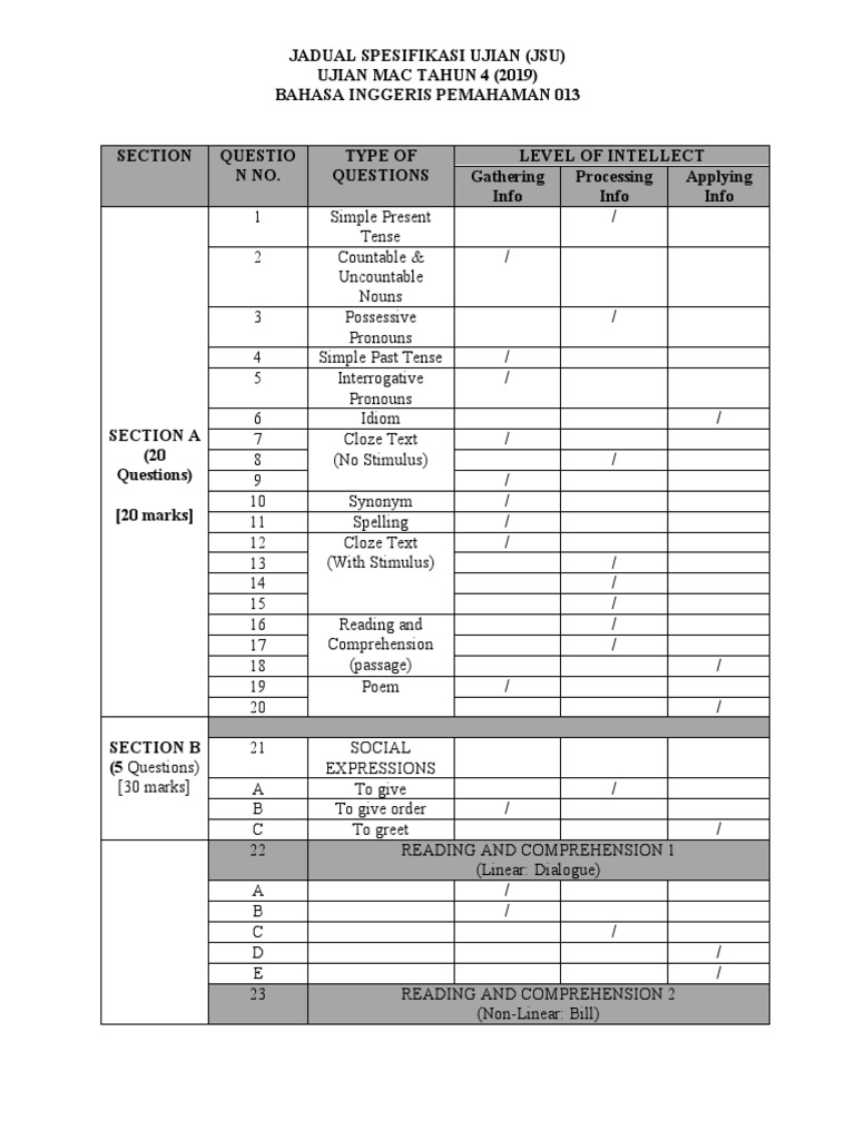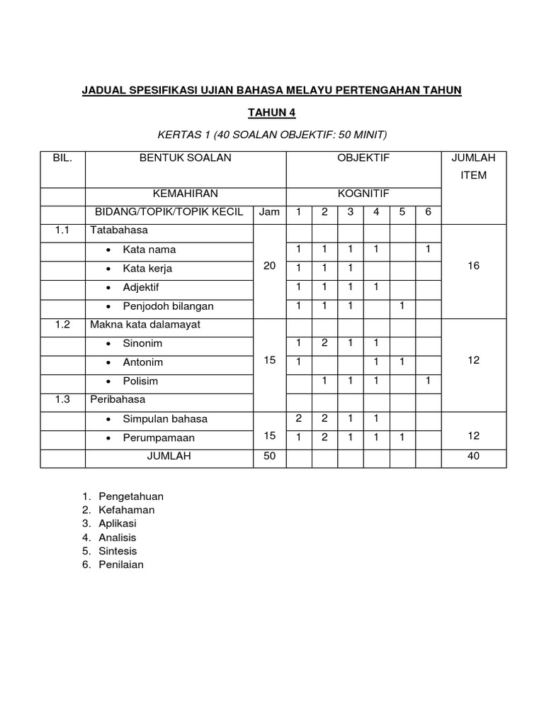 Jadual Spesifikasi Ujian Bahasa Melayu Pertengahan Tahun Pdf
